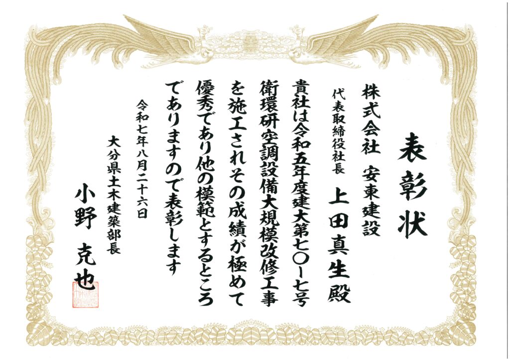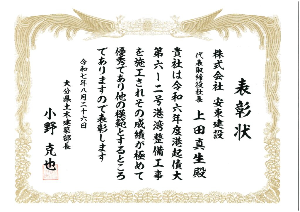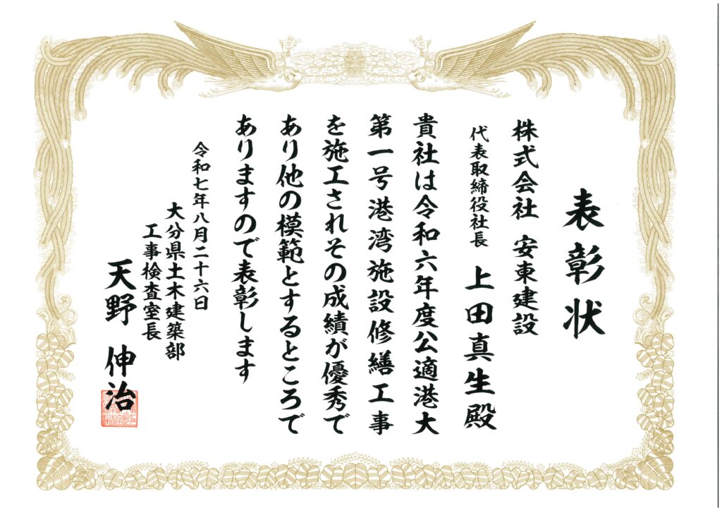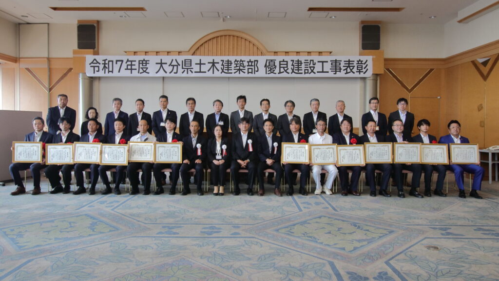 令和7年度 土木建築部優良建設工事表彰 2025年8月27日 お知らせ 令和7年8月26日(火) 令和7年度土木建築部優良建設工事表彰授与式が執り行われました。弊社は舗装工事、機械器具設置・管工事の部門で土木建築部部長表彰を海洋土木工事部門で工事検査室長表彰を賜りました。今回、3件もの表彰を賜りましたのも工事関係者や近隣に住まわれている方々のご指導・ご鞭撻あって「高品質・安心・安全」な施工ができた結果だと思っております。今後とも、社員一同、尽力してまいります。 【土木建築部部長表彰受賞者】 【工事検査室長表彰受賞者】 次の記事 > お知らせ一覧