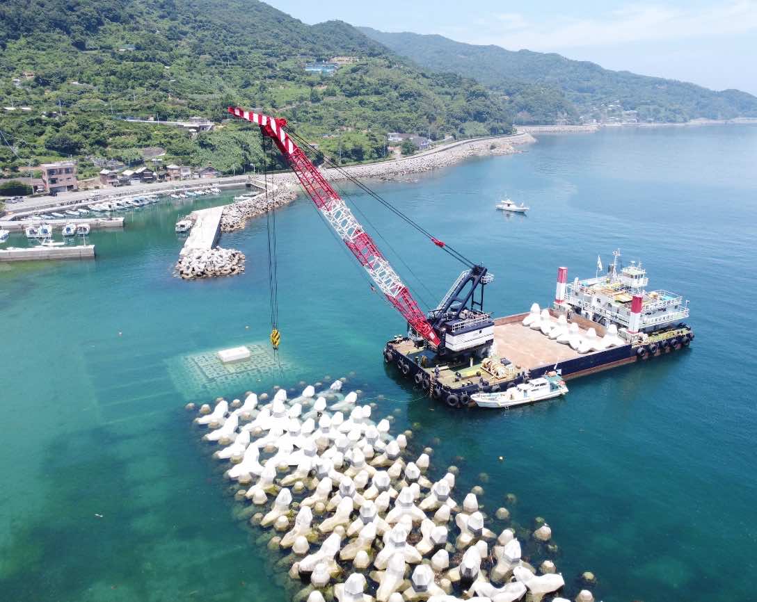 港湾・漁港の建設による海上物流の促進と安全の確保、水産関連施設(魚礁)造成による水産自然の保護と増殖などのために当社では、海洋土木工事を幅広く手掛けています。